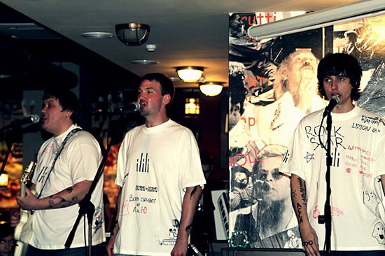 Павел Яскевич: Позже к нам присоединился Дима Есеневич. Все играли на гитарах, все писали песни. Первый концерт в "большом" составе – вместе с Ромой Подоляко и Виталием Любецким – был в "Граффити" в 2004 году. Было сыро, весело и много друзей. Где-то в 2005 году было большое выступление на сцене Академии – три отделения, 53 песни, многие из которых впервые репетировались в тот же день, но в нас была какая-то наглость и острое желание, чтобы эти песни услышали. После него мы решили заморозить проект до лучших времен.